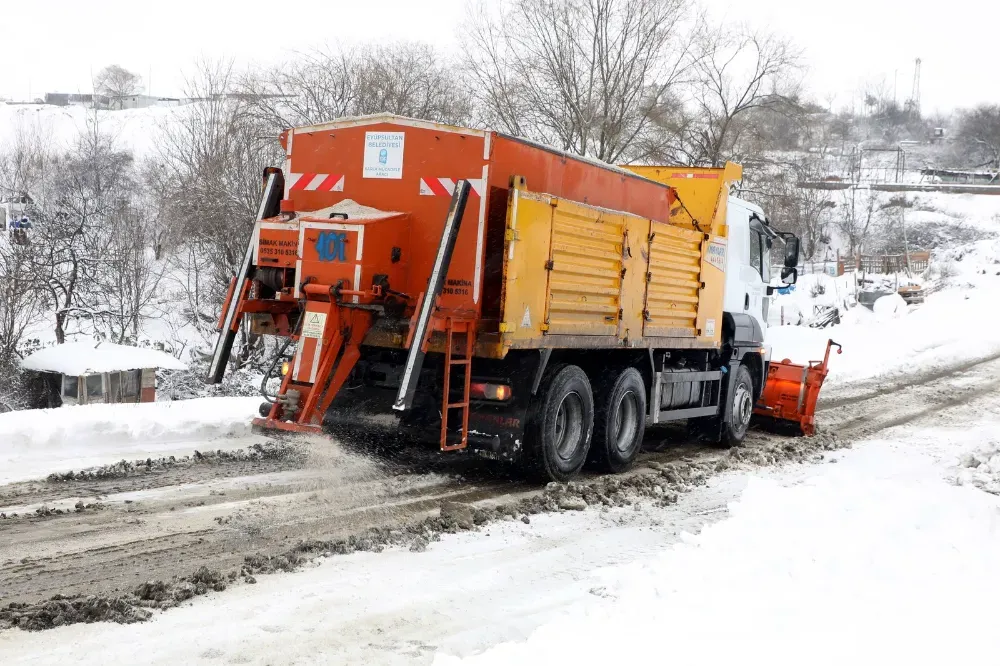 Eyüpsultan Belediyesi karla mücadele ekipleri gece saatlerinde başlayan yoğun kar yağışı ile birlikte ilçe genelinde 29 mahallede 52 araç ve 118 personelle görev aldı.
