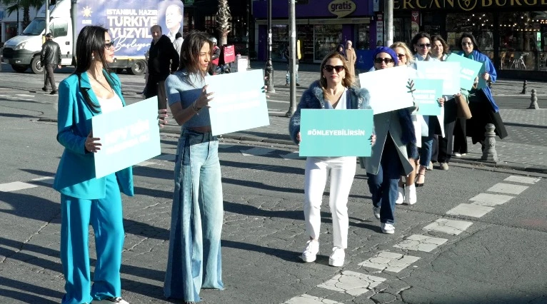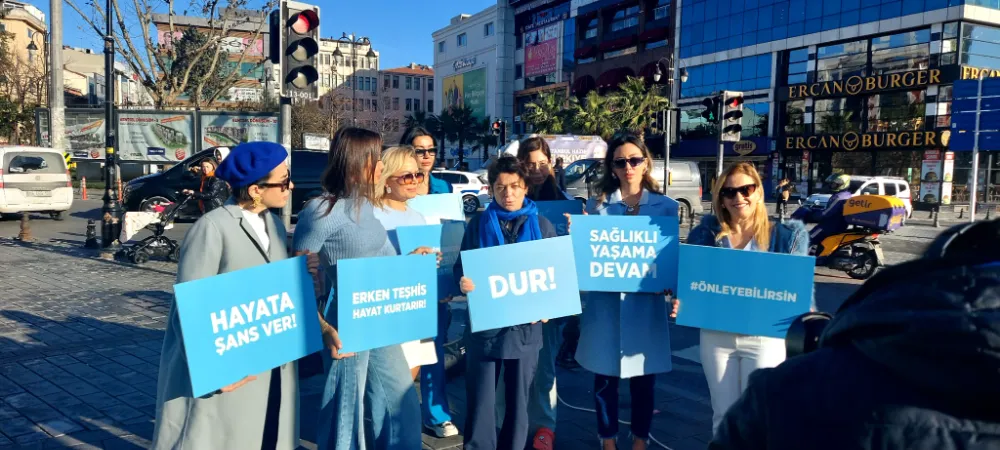Kanser Savaşçıları Derneği Başkanı Belma Kurdoğlu Akgün ve Sosyal Hizmet Uzmanı Cansu Çuvalcı’nın da aralarında olduğu mavi kadınlar, trafik ışıklarında yaya geçidinde yürüdüler.